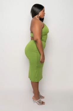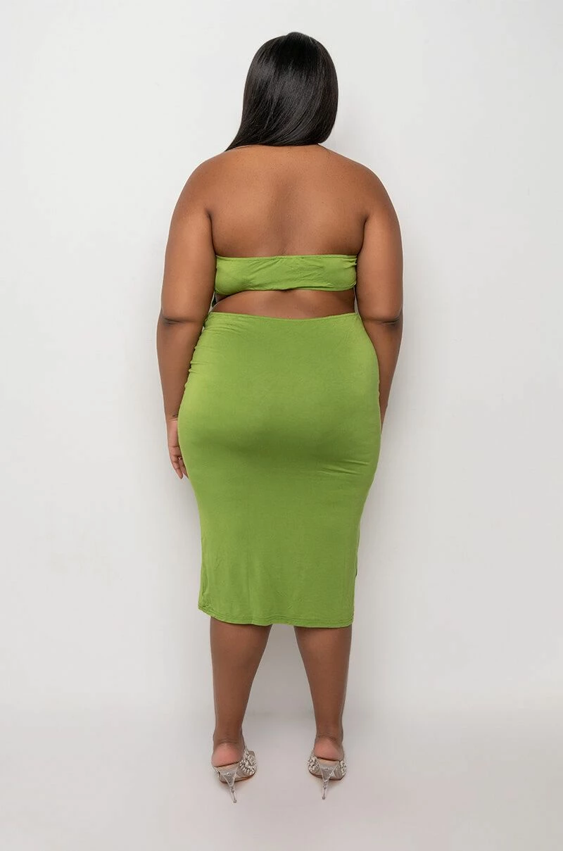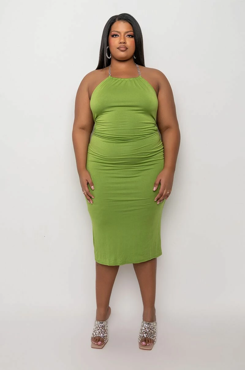 The PLUS AKIRA Label Stop Staring Open Back Midi Dress is made from a soft cotton fabrication and is complete with a halter neckline with adjustable rhinestone chain detailing, an open back, midi length, a pull-on silhouette, and a smooth lining.