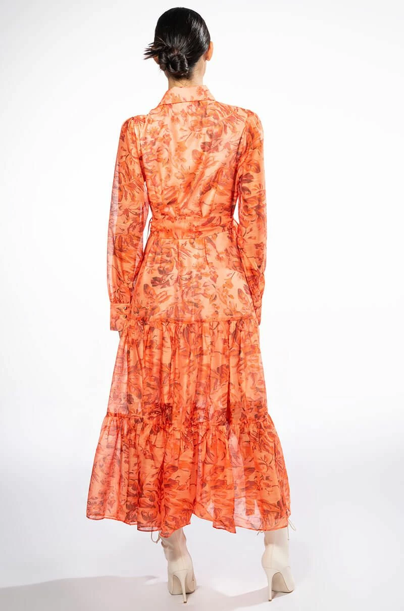 The AKIRA Label Pure Romance Long Sleeve Floral Print Maxi Dress is an elegant maxi length dress featuring a collared neckline, long sleeves, button cuff detailing, a sheer floral print chiffon overlay, a smooth inner lining, and a button up front closure. Complete with faux gold button front detailing. Looks super chic paired with knee high boots and a longline jacket.
