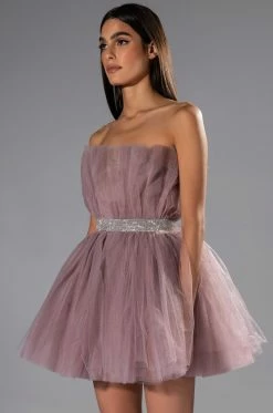 The AKIRA Label Rendezvous Sleeveless Feather Mini Dress features a layered mesh fabrication, wide tank straps, a v neckline, opulent real feather trim, rhinestone accents, a mini length silhouette, and a tonal back zipper closure. Complete with a smooth inner lining.