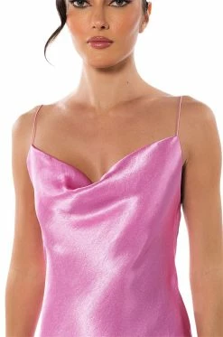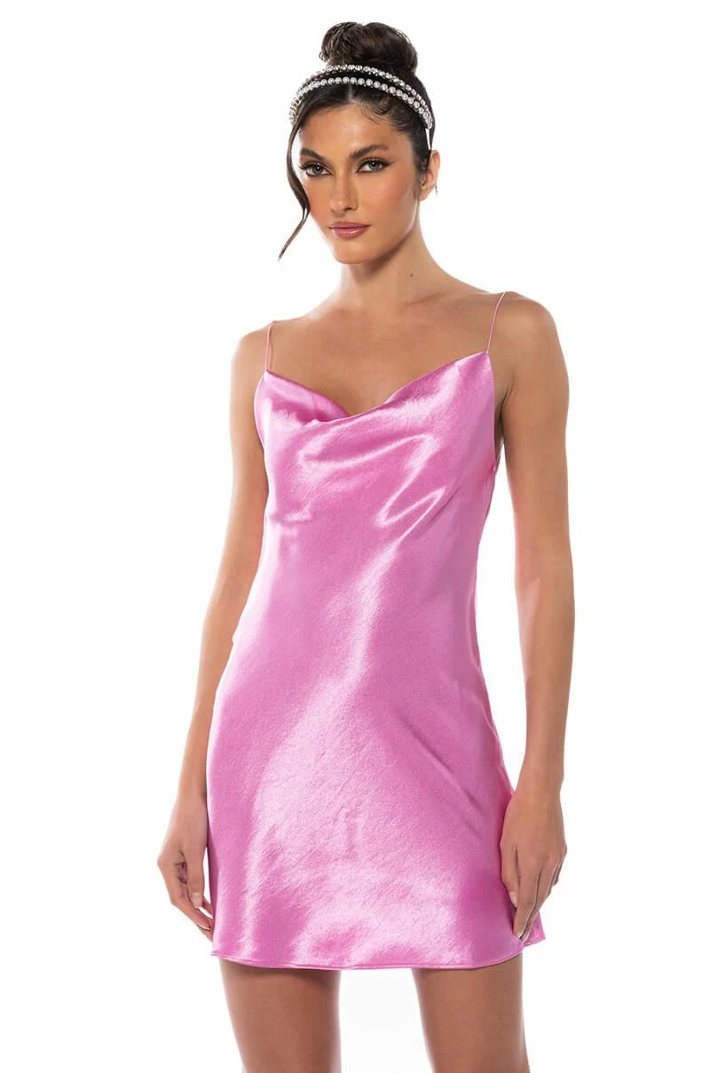 The AKIRA Label Romance Lives On Cowl Neck Mini Dress In Purple is made from a slinky, textured fabrication and features a cowl neckline, thin, stretchy tank straps, a mini length silhouette, a sexy open back, and a slip-on fit. Pair this piece with strappy stilettos and a clutch to complete your love-filled look.