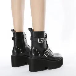 The elements of gothic style boots are in it, PU, lace-up, cross chain-trimmed and belts with key-holes. You are the cool and statement woman. Steady chunky platform brings comfort to you , making you relax for one day. Chunky platform could let your legs slimmer and optimize your body ratio. You are the one.