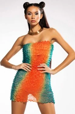 Sipping pretty. The AKIRA Label Sangria Textured Tube Mini Dress is a sweet popcorn texture mini featuring a strapless neckline, a sheer tri-color ombre base, allover textured detailing, a pull on fit, and lots of stretch. Pair with an oversized jean jacket and thigh high boots.