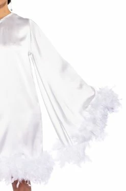 The AKIRA Label Shes All That One Sleeve Feather Mini Dress in White is made from a sleek, satin base fabrication, and features a one shoulder silhouette, a long sleeve with a feather trimmed flared wrist, and a mini length. Complete with an opulent, feather trimmed wide hemline. This sexy and chic party dress can be paired with The AZALEA WANG Confetti Feather Stiletto Sandals for a finished look!