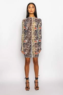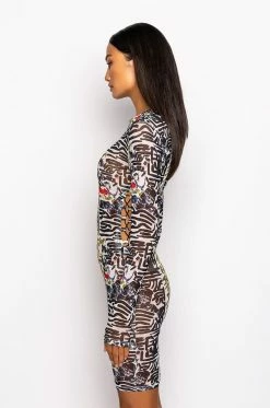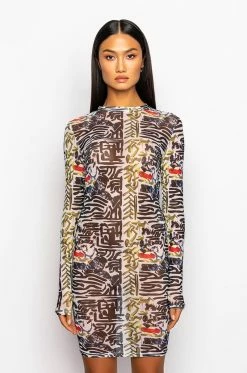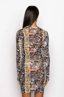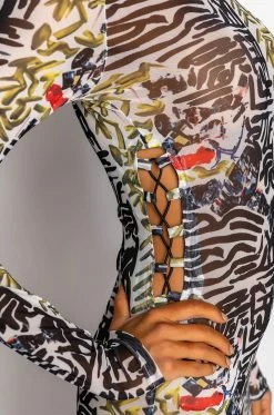 The SkyART X AKIRA Mini Mesh Dress is made from a sheer stretch mesh fabrication and features a bold abstract art multicolor print, mock neckline, long sleeves, sexy lace up side cutouts, a bodycon fit, mini length, and pull-on silhouette. Pair this jaw-dropping piece with pumps for a sexy night-out look!