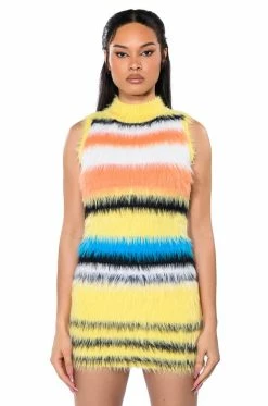 The AKIRA Label Striped Fuzzy Sweater Dress is part of the coziest two-piece set! Made from a fuzzy, stretch knit base fabrication, it features a colorful striped design, a mock neck, and sleeveless silhouette. Complete with a midi length and a bodycon silhouette. Pair with the matching AKIRA Label Striped Fuzzy Cardigan and booties for the full fantasy!