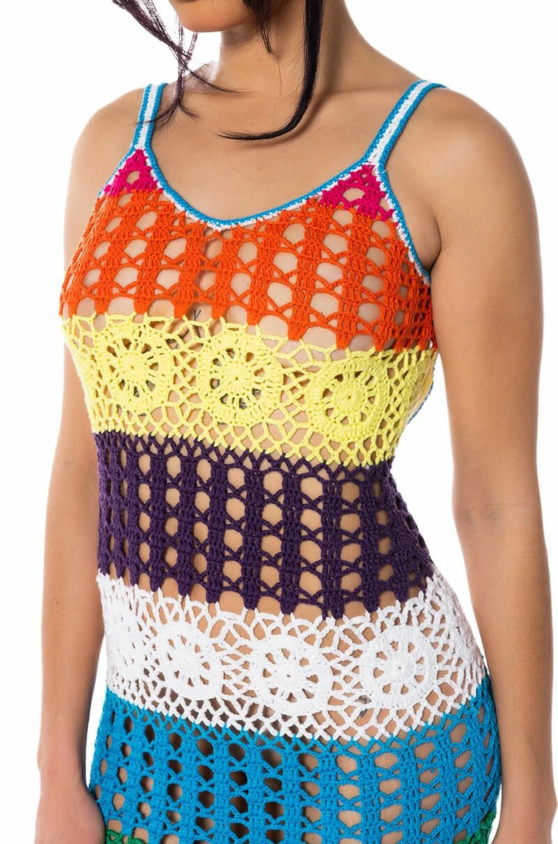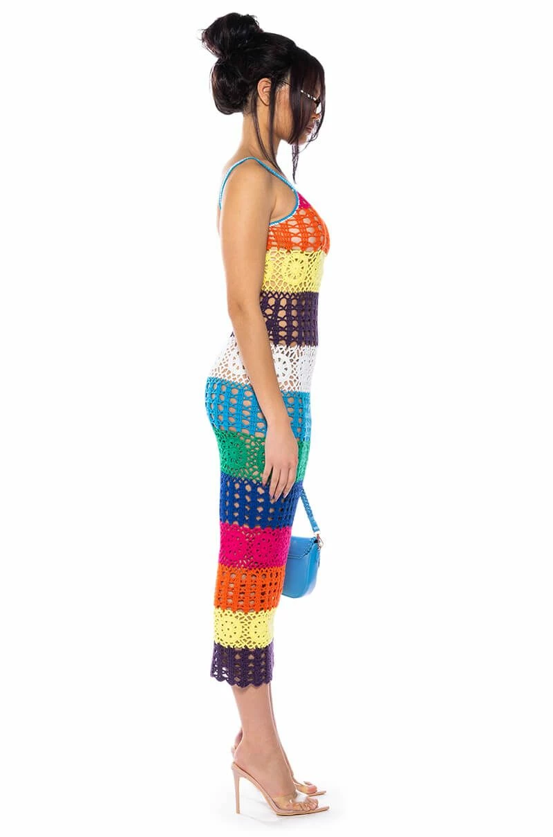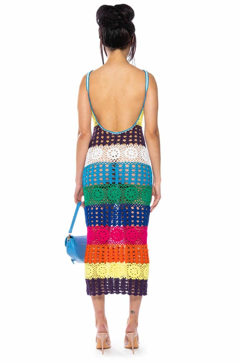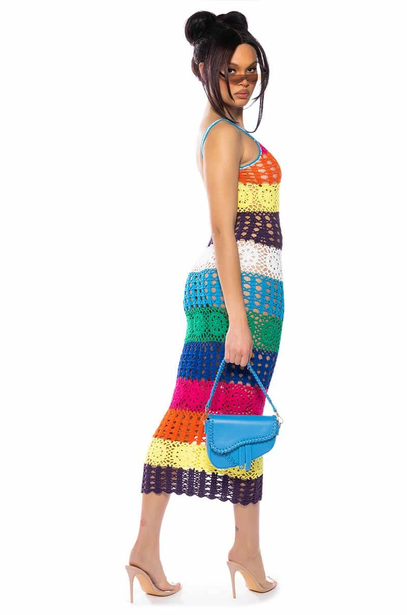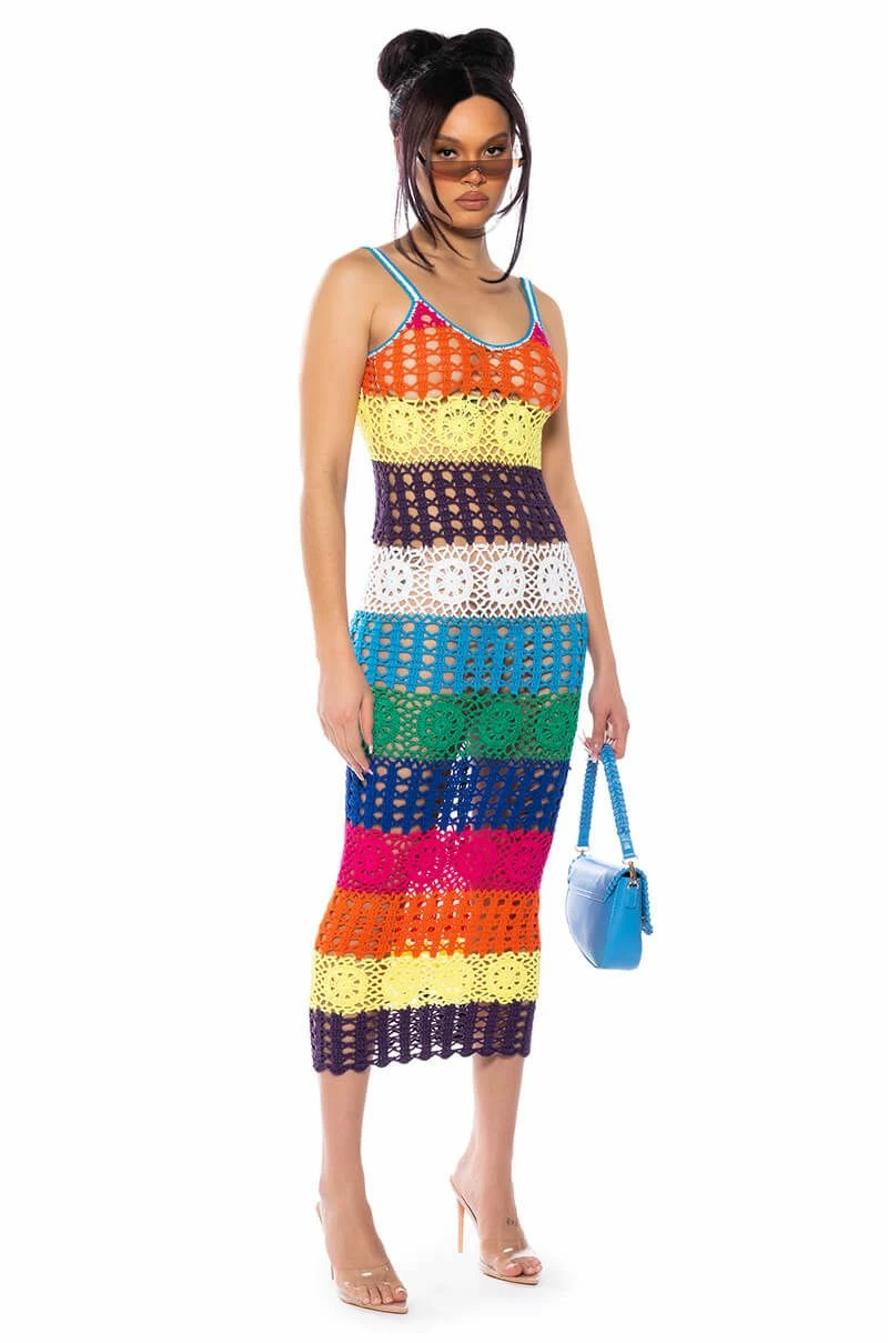 The AKIRA Label Sunkissed Goddess Low Back Knit Maxi Dress is made from an unlined knit fabrication and features rainbow color paneling, slim tank straps, a V neckline, a sexy low back, a maxi length silhouette, a scalloped hem, and a pull-on fit. Wear this piece over bodysuits or bathing suits to show off your cute layered look!