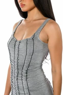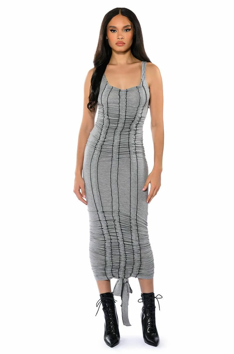 The AKIRA Label Take Me Away Cinched Maxi Dress is made from a soft knit fabrication and features tank straps, a rounded neckline, cinched body detailing with contrast stitch trim, a sexy bodycon fit, a maxi length silhouette, and a tie detail hem.