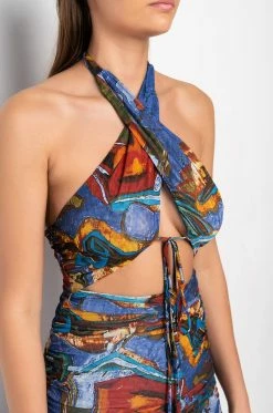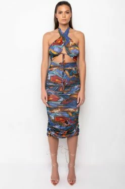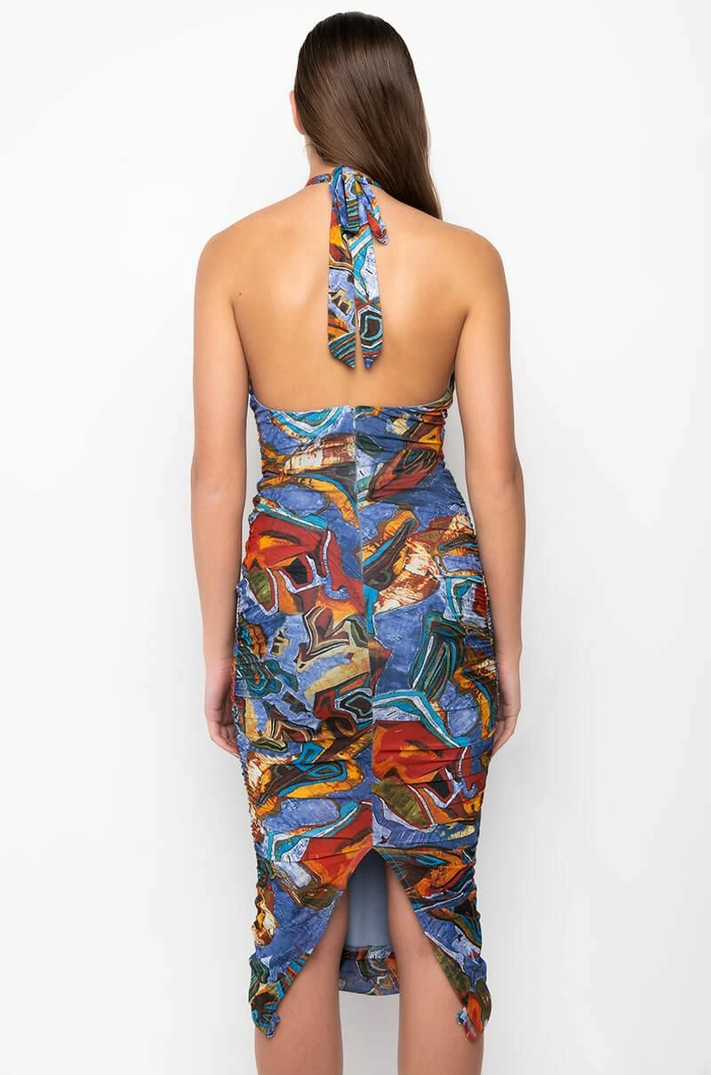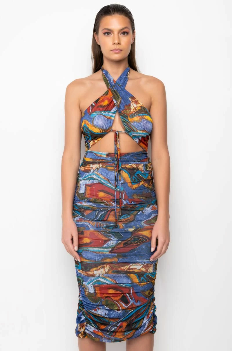 Take me away! The AKIRA Label Take Me There Wrap Top Midi Dress is a sweet escape from the everyday. This stretch mesh piece features an abstract multicolor print pattern, tie back halter neckline, a cut out bodice, an open back with tie back closure, a back slit, and a midi length. Complete with a smooth inner lining, side ruched detailing, and a back zipper closure.