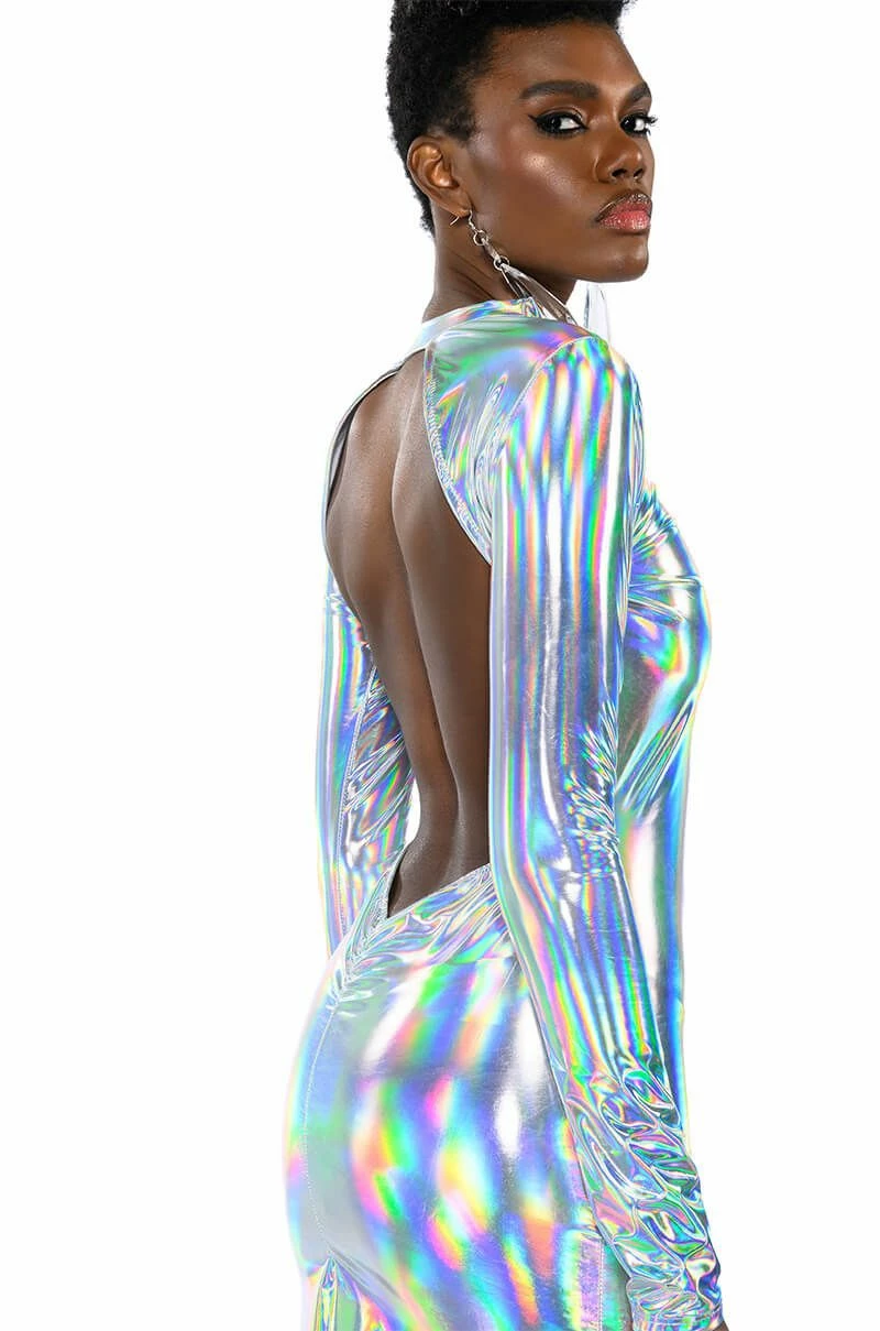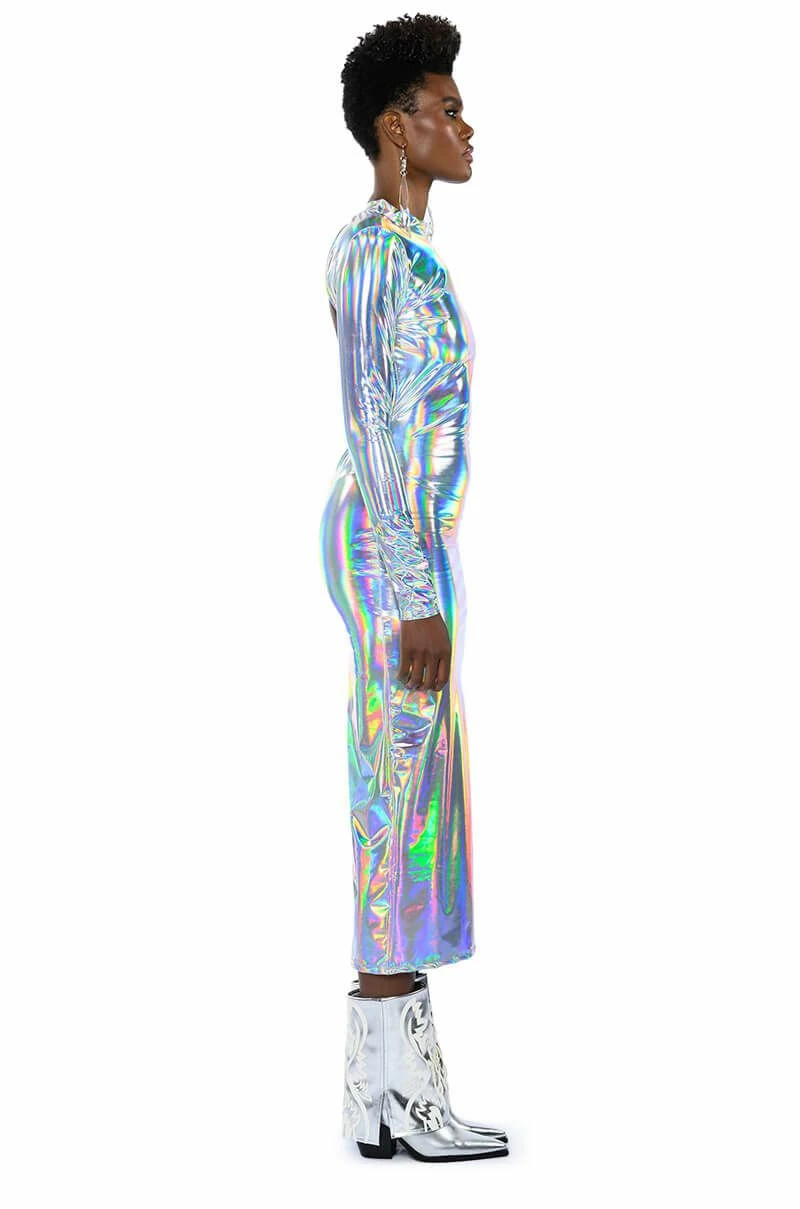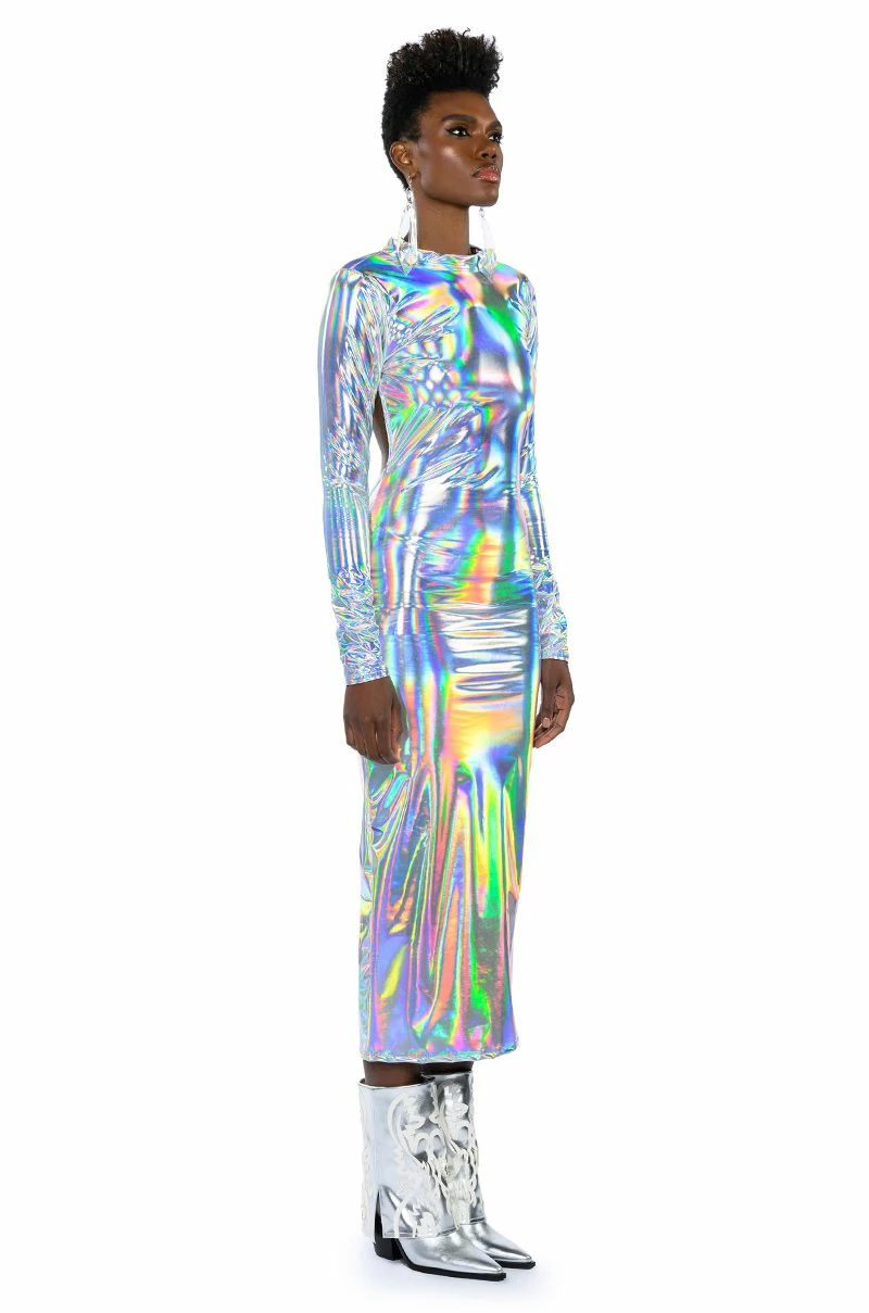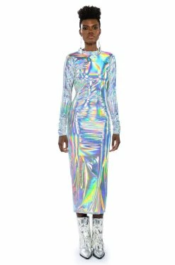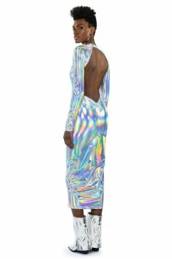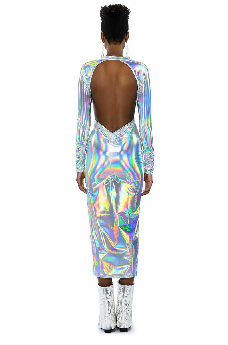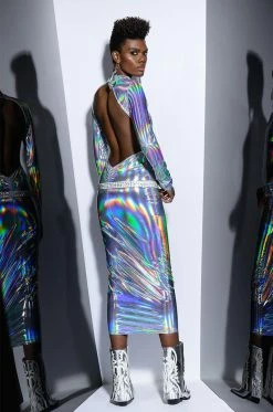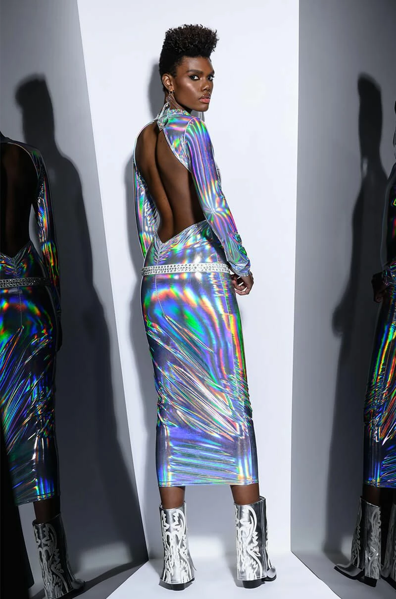C’mon Alien Superstar! The AKIRA Label Talk About Me Holographic Midi Dress features a slick, holographic fabrication, a mock neckline, and long sleeves. This sexy party-ready piece is complete with a midi length silhouette, a backless design, ruching at the back, and a pull on fit. Match with The AZALEA WANG Juno Holographic Stiletto Pump for an out of this world metallic masterpiece!