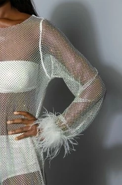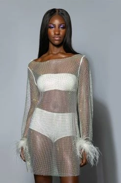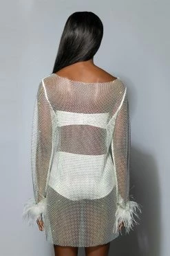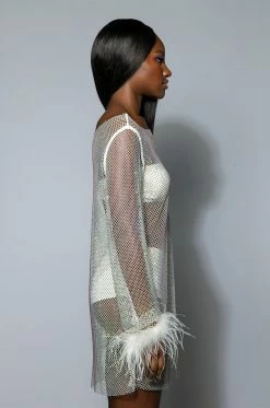 Can you keep a secret? We’re obsessed with The AKIRA Label Tell Me A Secret Sparkle Mini Dress. This rhinestone embellished piece features a sheer, fishnet base, a scoop neckline, and mini length. Complete with long sleeves and feather trimmed cuffs. Pair this bling’d up dress with rhinestone studded stiletto boots, and you’re party ready!