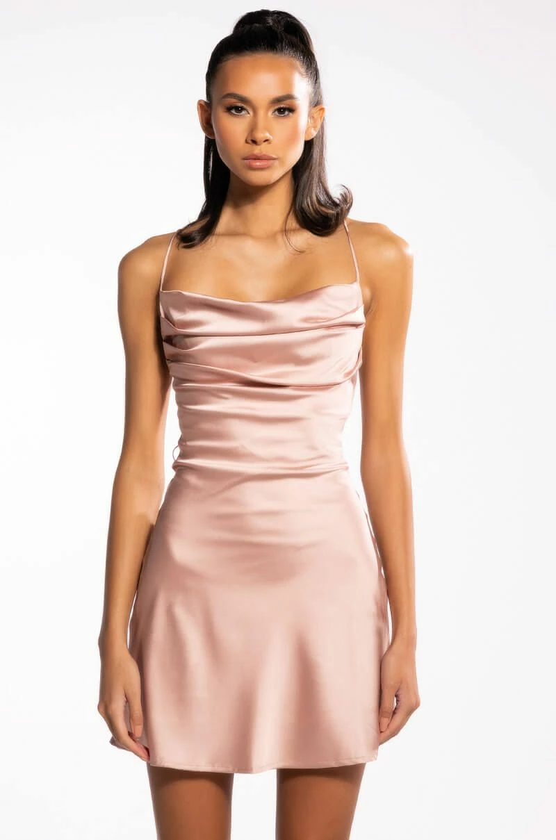The AKIRA Label Tiny Dancer Sleeveless Satin Cowl Neck Mini Dress is a flirty satin number featuring a cowl neckline, adjustable cross back tank straps, and a whimsical skater skirt. Amp up the sex appeal with the open back, detailing and mini length. Hit your bff’s wedding venue in style with some square toe sandals and oversized sunnies.