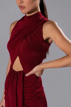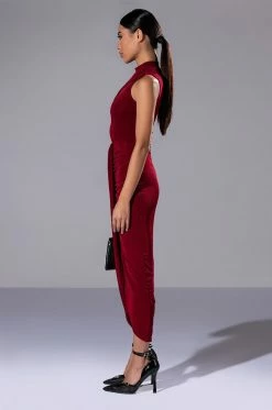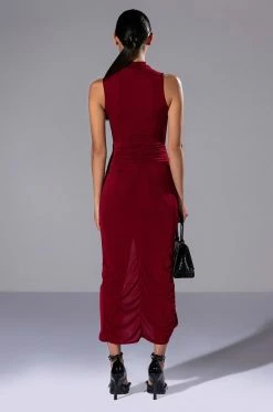 The world is your runway in The AKIRA Label Walk The Walk Sleeveless Midi Dress. This chic draped jersey dress features a sleek, stretchy fabrication, a mock neckline, ruched front detailing, a draped sash accent, a keyhole cut out accent, and sleeveless silhouette. Complete with a midi length and a sexy side slit for easy walkability. Pair with knee high boots and a pleather trench for a chic look.
