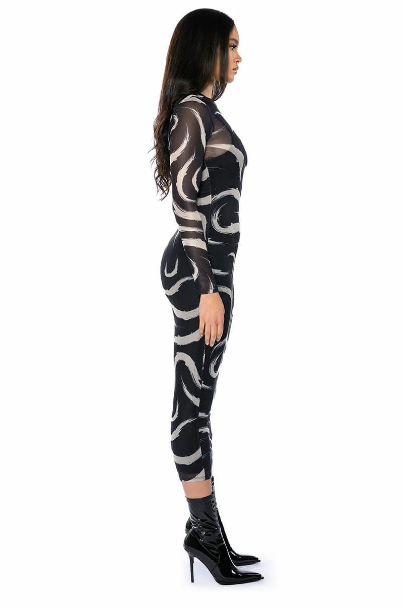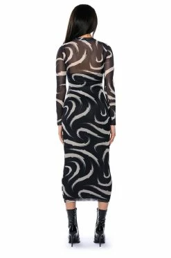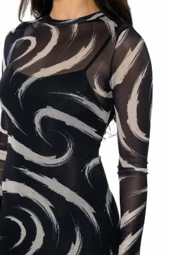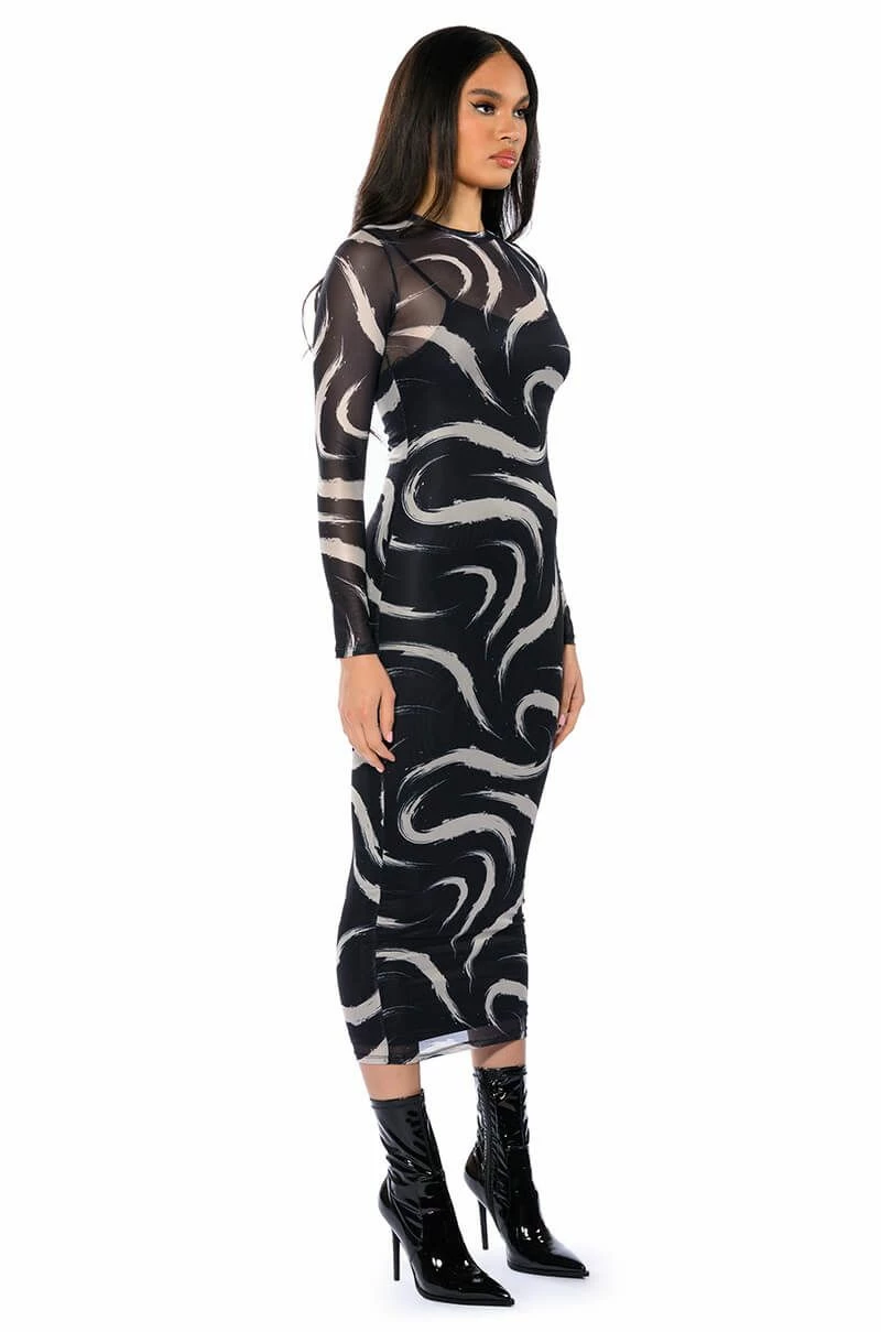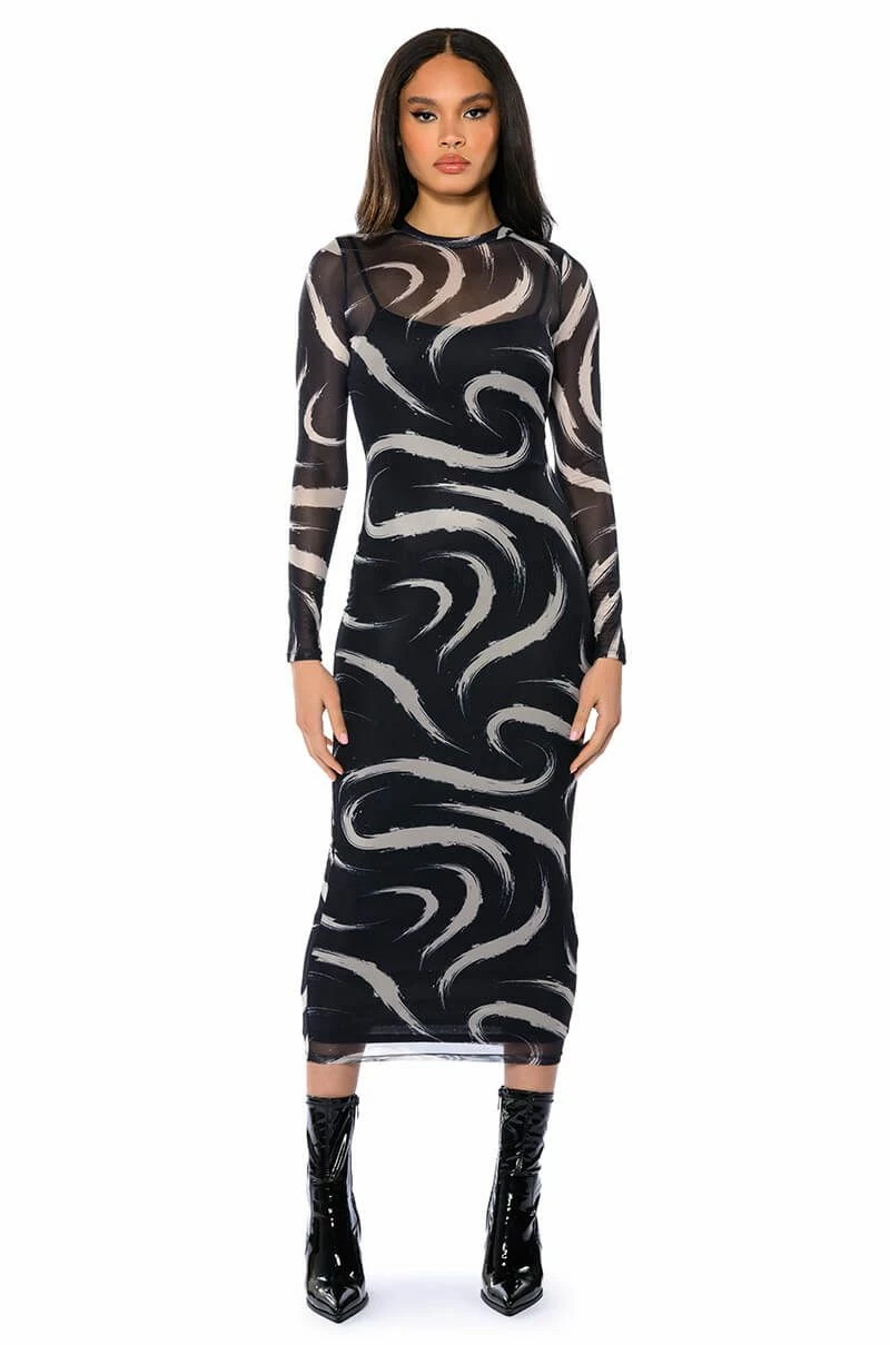 The AKIRA Label Wish You Knew Mesh Long Sleeve Maxi Dress is made from a sheer, mesh base and features a small mock neck, long sleeves, and a maxi length. Complete with an allover swirling paint brushed print design, an attached inner slip dress, and a form-flattering bodycon fit. Pair with strappy sandals and a glam shoulder bag to leave them wanting more!