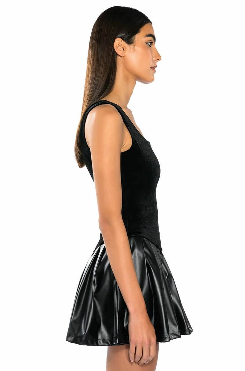 If this is wrong, we don’t wanna be right. The AKIRA Label Wrong Decisions Pleated Mini Dress in Black features a velvet base, a square neckline, wide tank straps, and an attached pleather pleated skirt. Complete with a mini length silhouette, and a smooth, stretchy inner skort lining for comfort and coverage